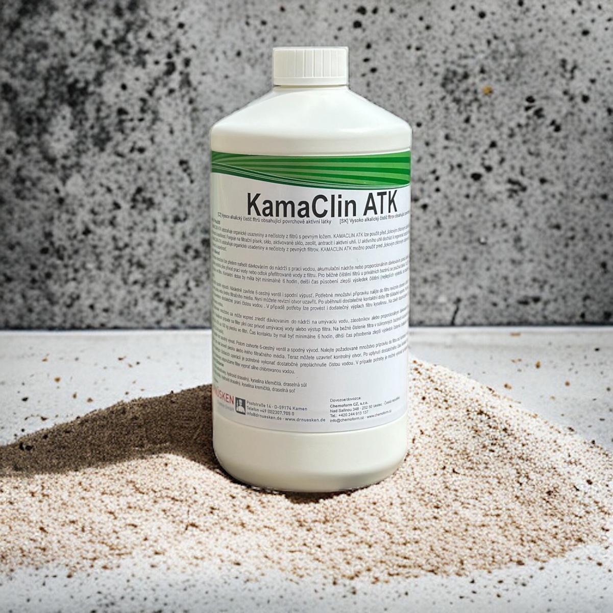 KamaClin ATK je speciální silně zásaditý čistič na hloubkové čištění filtrační náplně. Po sezóně nebo před sezónou dokonale vyčistí náplň filtru.